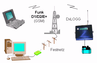 Kommunikationsmöglichkeiten![]() Mögliche Empfangs- und Sendegeräte für DxLOGGBenachrichtigen Sie bis zu 6 Empfänger gleichzeitig Aktionsauslösung per Handy, PC oder per Email Datenauslesung vom PC mit Software DxLEIT/UNINET ![]() Wie mit DxLOGG Verbindung aufgenommen wird!Modomverbindung zum DxLOGG aus dem Fest- oder Mobilfunknetz Lieferumfang